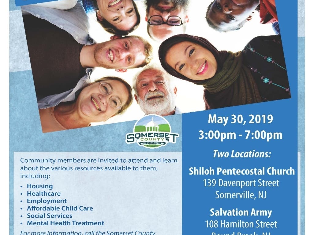 Each Community Resource Fair will run from 3 to 7 p.m. at the following locations: Shiloh Pentecostal Church, 139 Davenport St., Somerville, and the Salvation Army, 108 Hamilton St., Bound Brook. All are welcome. Door prizes for adults and children will be offered and the first 50 adults at each location will receive a free personal care kit. The events are designed to be family-friendly and will include snacks and refreshments.