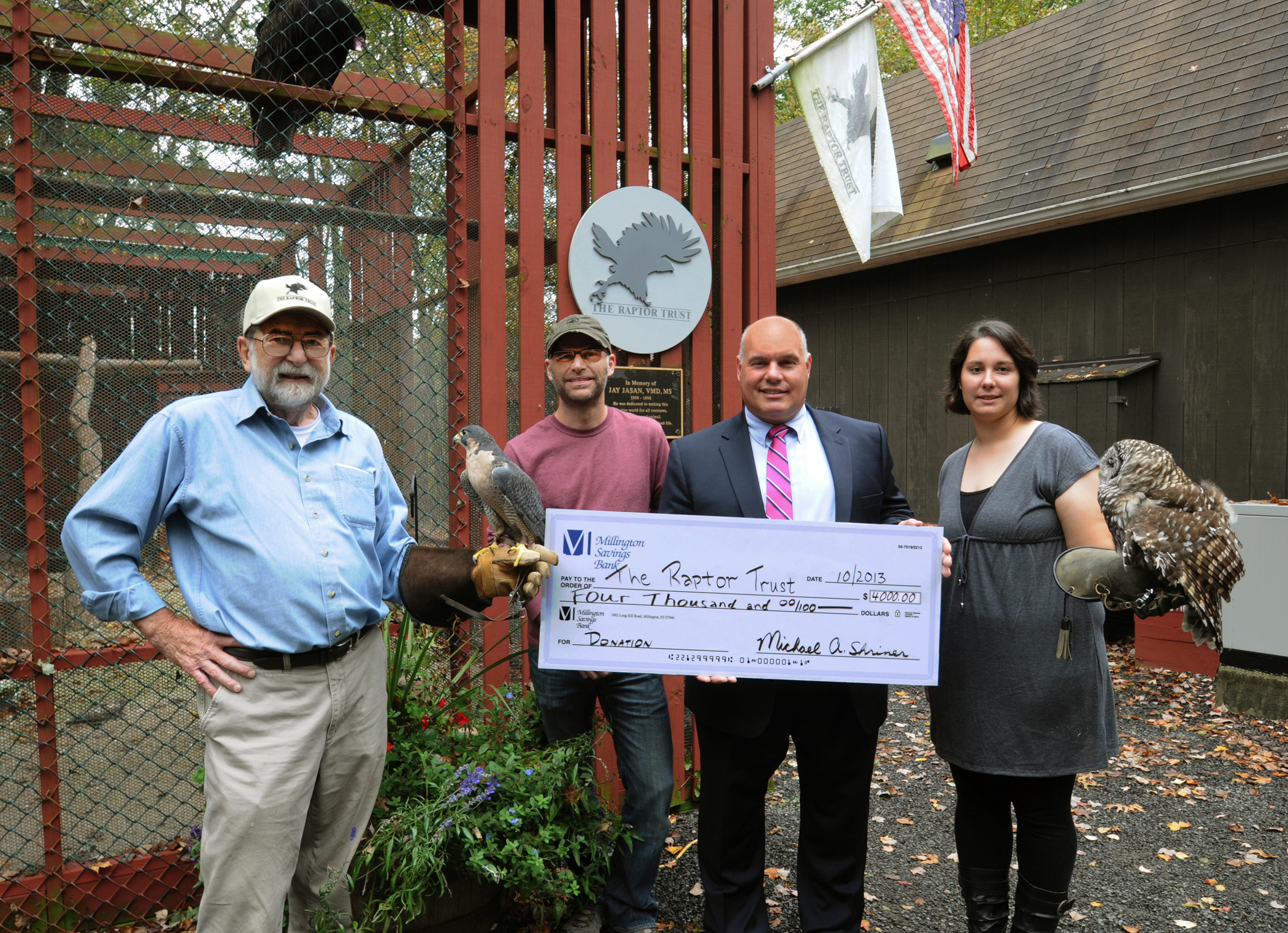 Millington Savings Bank, The Raptor Trust’s nearby neighbor in Millington, has been a sponsor of the organization for many years. “We’re impressed by the dedication of Dr. Len Soucy and his staff to their tireless care for the birds, and are proud to support their cause,” stated Michael Shriner, President/CEO of the bank. “The Raptor Trust depends on private donations for its existence, so without the involvement of the local community, the institution could not survive. We are pleased that our bank’s 2013 donation comes at a time when additional funding is so critically needed.”