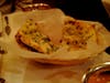 While we had been perusing the rather large and comprehensive menu, the waiter brought us an order of papadam and four colorful chutneys: mint sauce, onion relish, tamarind sauce and onion/cucumber tossed with cilantro. Papadam is a light, crisp wafer made with lentil flour. Topped with both a bit of the spicy onion relish and mint sauce, you get that great sensation of simultaneous hot and cold.