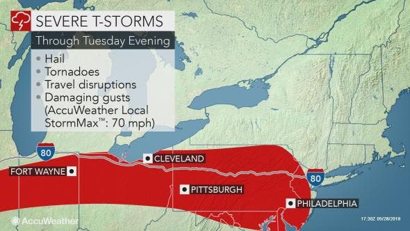 "It appears that the states of Ohio, Pennsylvania, West Virginia and Maryland will have the highest risk for damaging thunderstorms and even a tornado," AccuWeather Senior Meteorologist Brett Anderson said in a release.