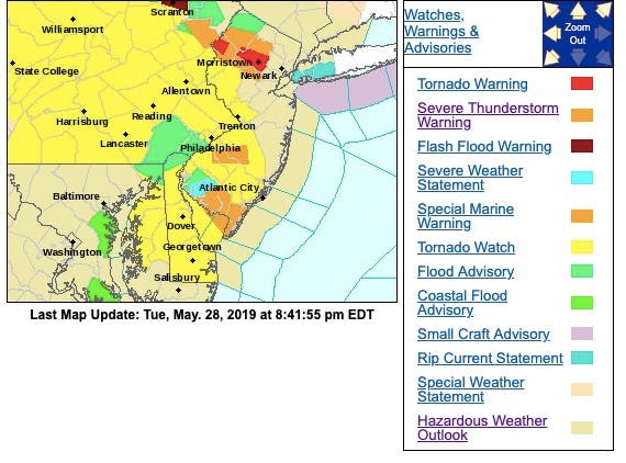 The National Weather Service issued the tornado watch in Burlington, Hunterdon, Camden, Mercer, Gloucester, Atlantic, Cape May, Cumberland and Warren counties. The watch is in effect until 10 p.m.