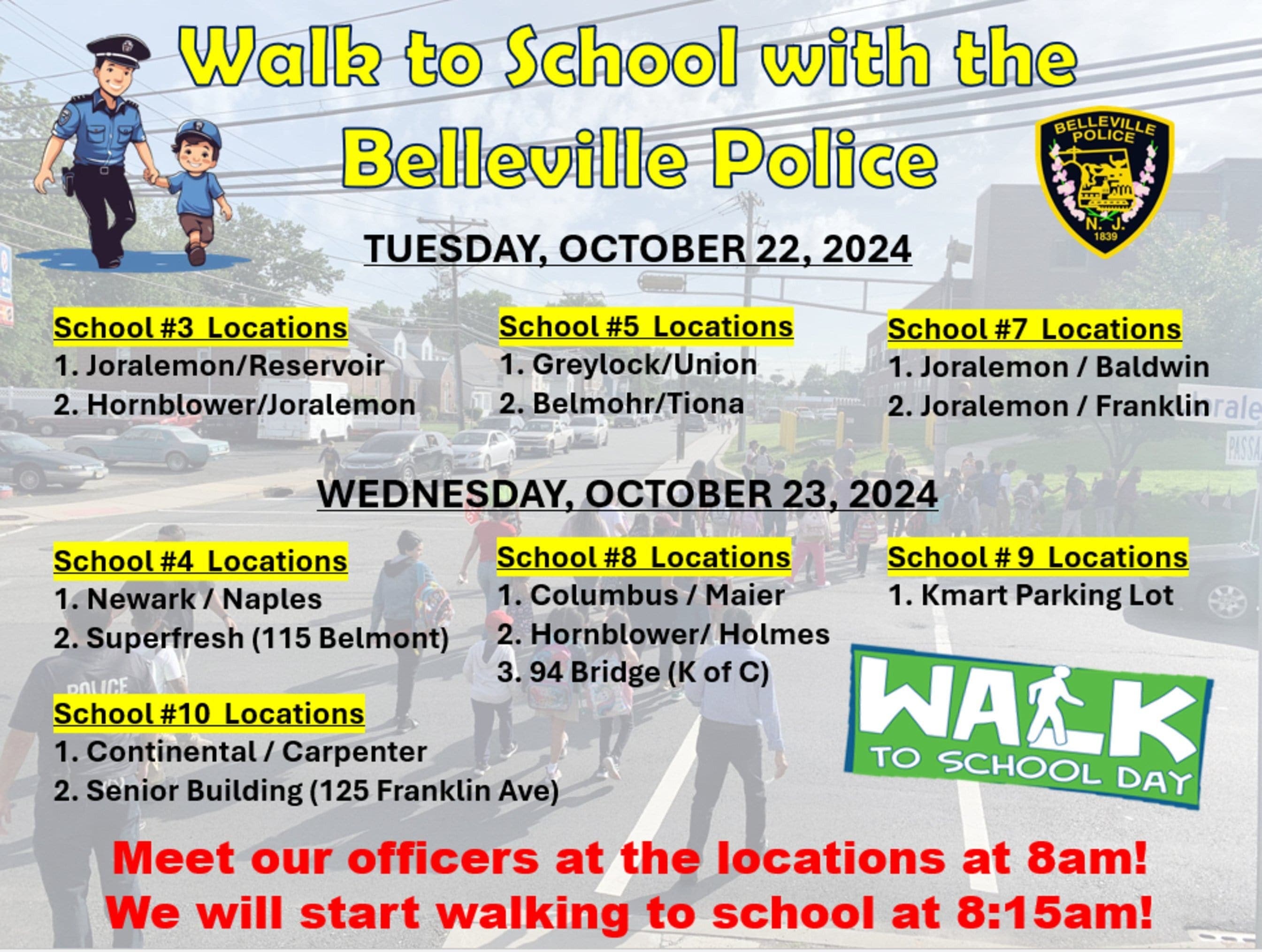 According to a township advisory, the Belleville Police Department will be participating in “Walk To School With A Cop Day” on Oct. 22 and Oct. 23. Officers will be meeting with local students and walking to school with them.