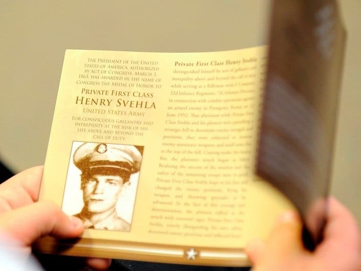 “Henry Svehla, who was born in Newark and lived for a time in Belleville, was awarded the Distinguished Service Cross for his heroism in the act that cost him his life in the Korean War. When an enemy grenade landed among a group of his comrades, Private First Class Svehla, without hesitation and undoubtedly aware of extreme danger, threw himself upon the grenade. Decades later, in a review of his action, his award was upgraded to the Medal of Honor and presented in 2011 to his surviving family members.”