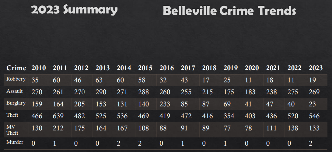 The Belleville Police Department released a crime total summary for 2023 (see graph below), noting that robberies have decreased 70 percent from a peak in 2013, burglaries are down 90 percent compared to a peak in 2016, and motor vehicle thefts are down 37 percent from a peak in 2011.