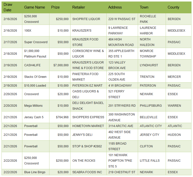 According to the New Jersey Lottery, the ticket matched all five balls in the Jersey Cash 5 drawing on Saturday, Feb. 21, capturing a $764,968 jackpot. The winning ticket was sold at Shoppers Express, 300 Washington Avenue in Belleville.