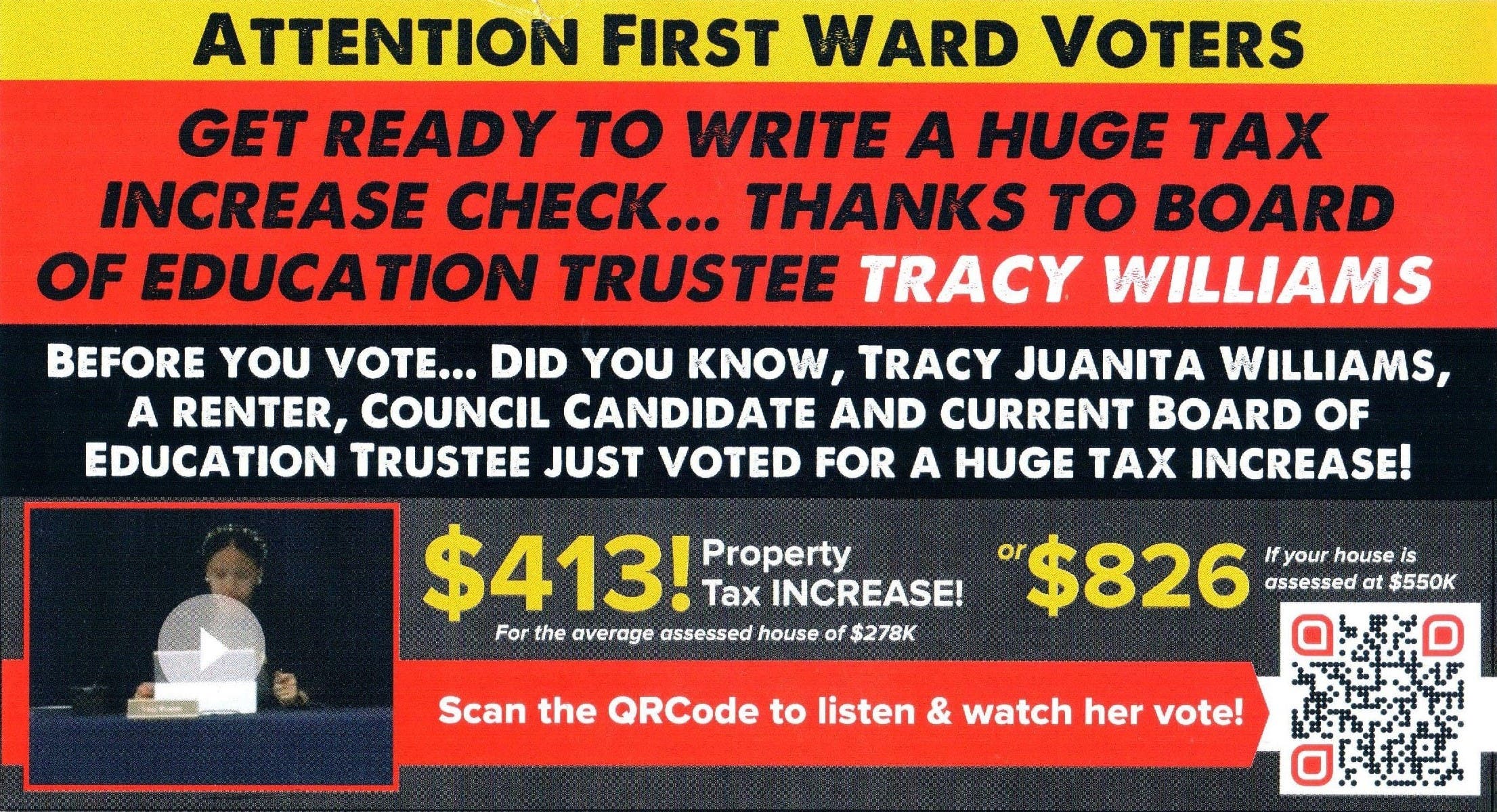 “Before you vote … did you know, Tracy Juanita Williams, a renter, council candidate and current board of education trustee just voted for a huge tax increase!” the flyer reads.