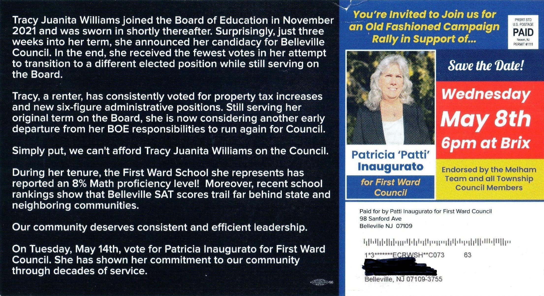 The back of the flyer – which states that it was “Paid for by Patti Inaugurato for First Ward Council” – blasts Williams for “consistently voting for property tax increases” among other criticisms. It also says that she is endorsed by the “Melham Team” and “all township council members.”