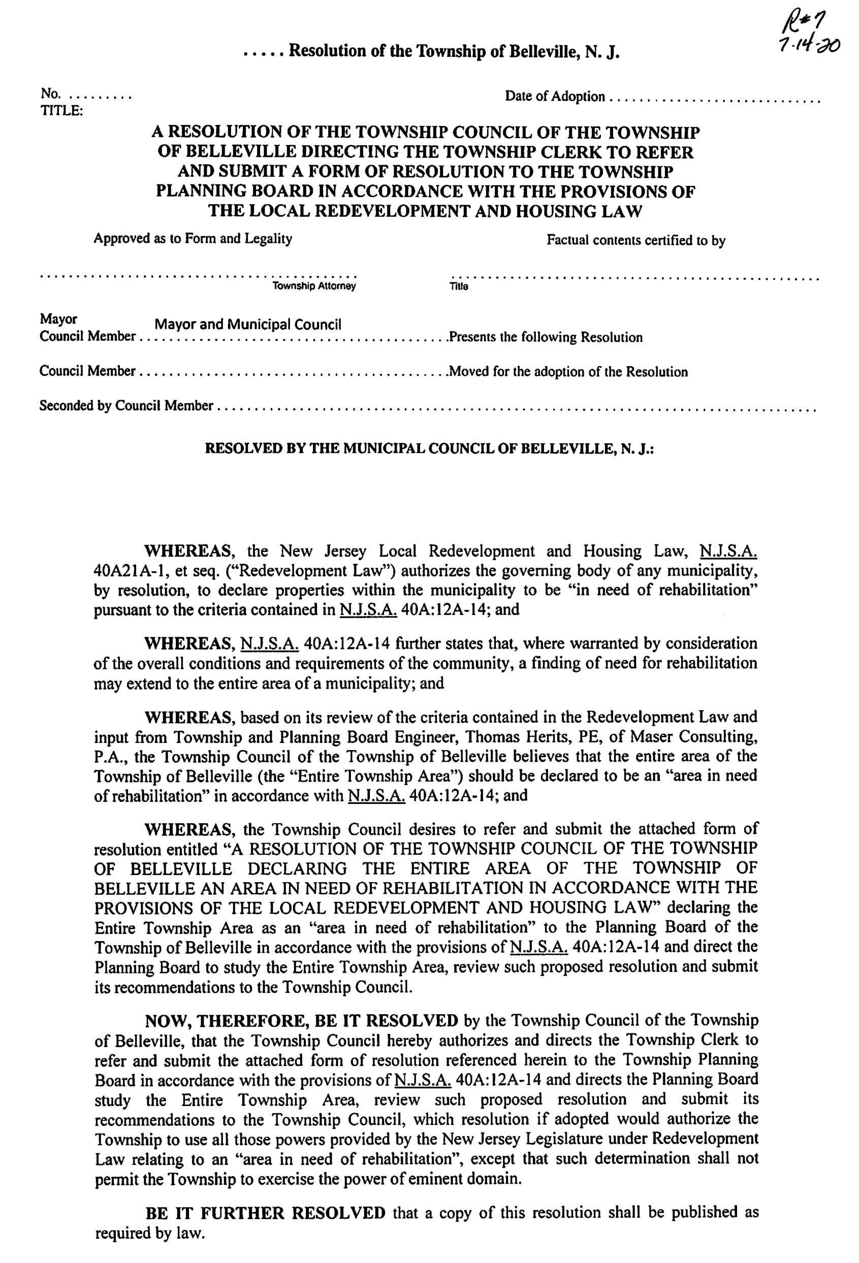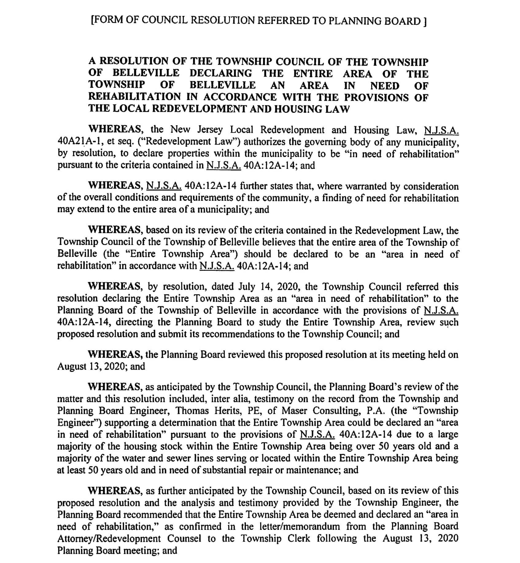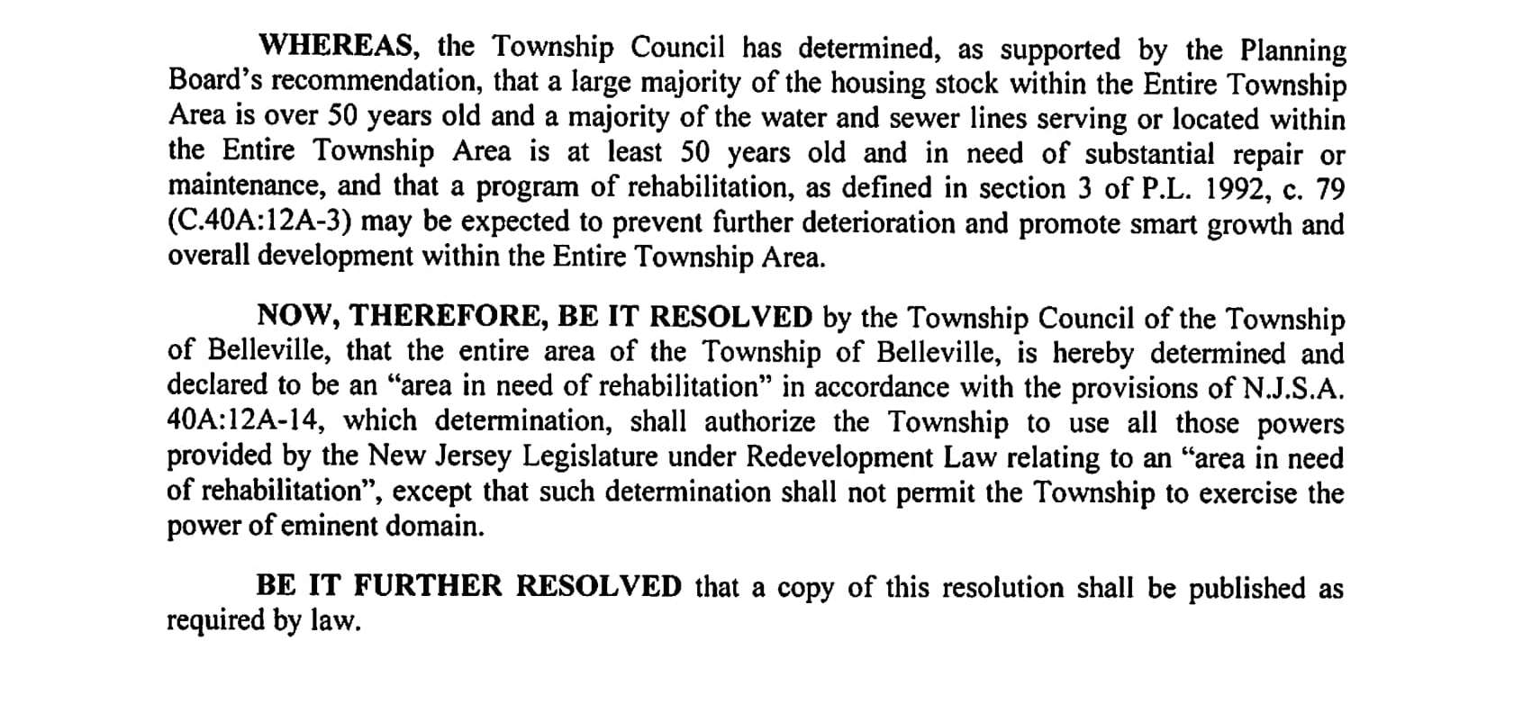 BELLEVILLE, NJ — A sweeping plan to designate the entire town of Belleville as an “area in need of rehabilitation” took a leap forward at Tuesday’s council meeting.