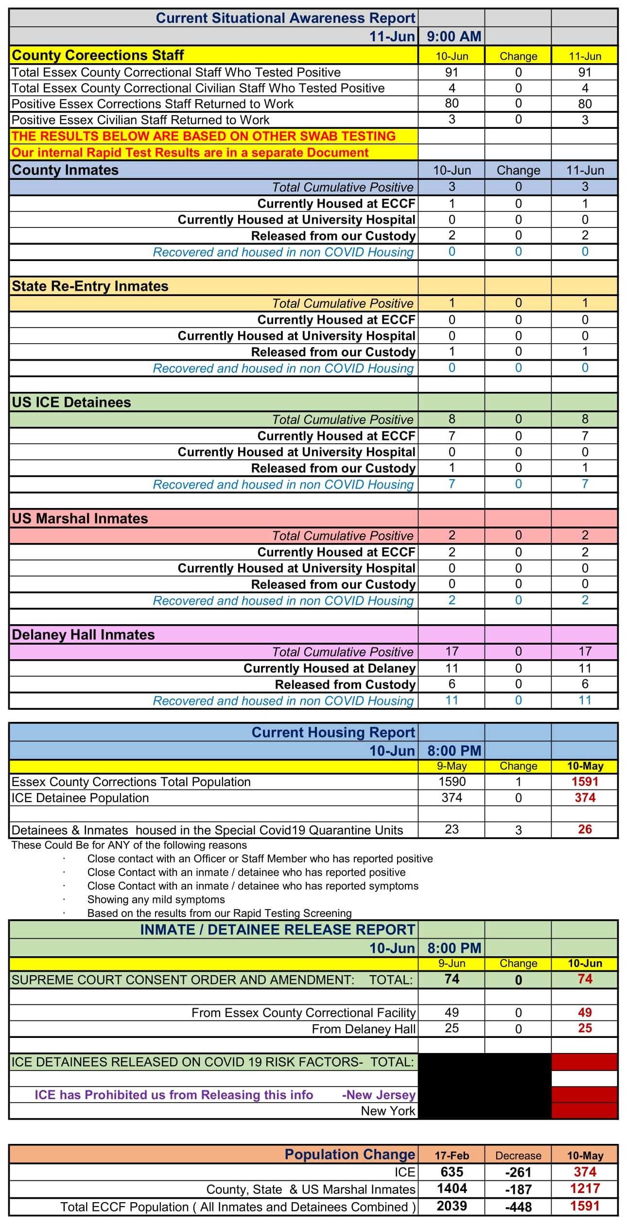 “Since the onset of the COVID-19 pandemic in mid-March, serious concerns have been raised regarding the spread of the virus inside the facility, the health of inmates and detainees, the health of staffers, and the likely possibility of the virus spreading outside of the facility. New Jersey, specifically Essex County, has been especially hit hard by COVID-19. There have been more COVID-19 positive cases and deaths in New Jersey than in any other state in the nation with the exception of New York; and Essex County, as of June 10, 2020, has had 1,723 deaths, which is more than any other county in the state. These unfortunate and tragic numbers highlight the need for government agencies and officials to consider all feasible possibilities to slow the spread of the virus.”