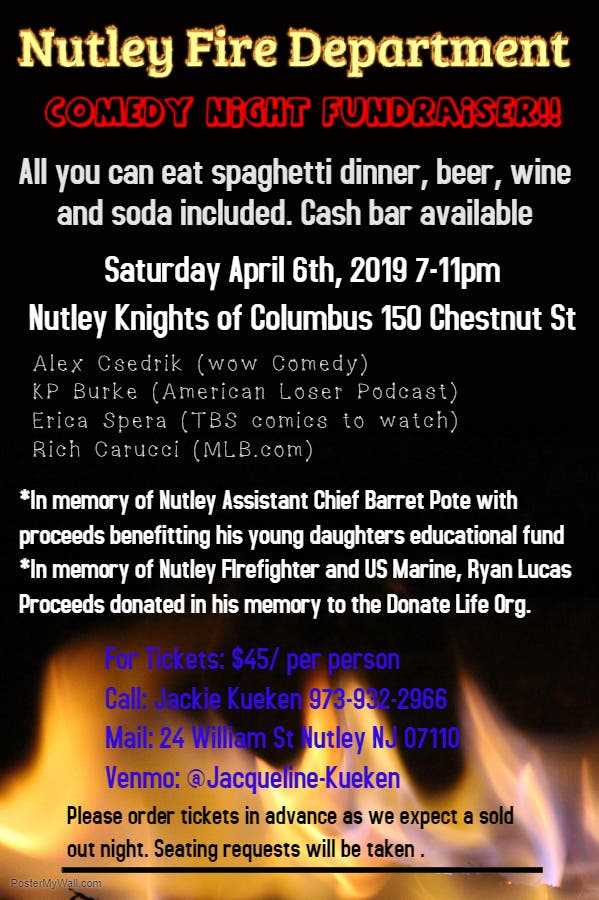 NUTLEY, NJ — The Nutley Fire Department is hosting a comedy-themed fundraiser to benefit the families of two firefighters on Saturday, April 6.