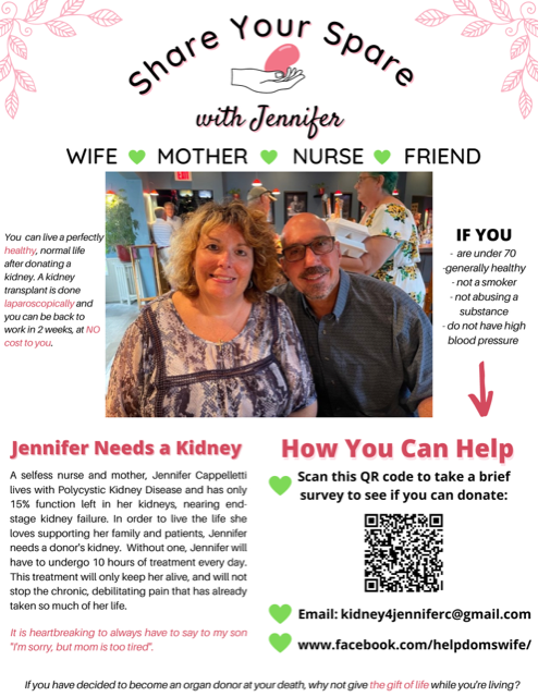 Think that you may have what it takes to be a donor? Cappelletti said people can contact her transplant center online here. They can also reach out directly to her at kidney4jenniferc@gmail.com.