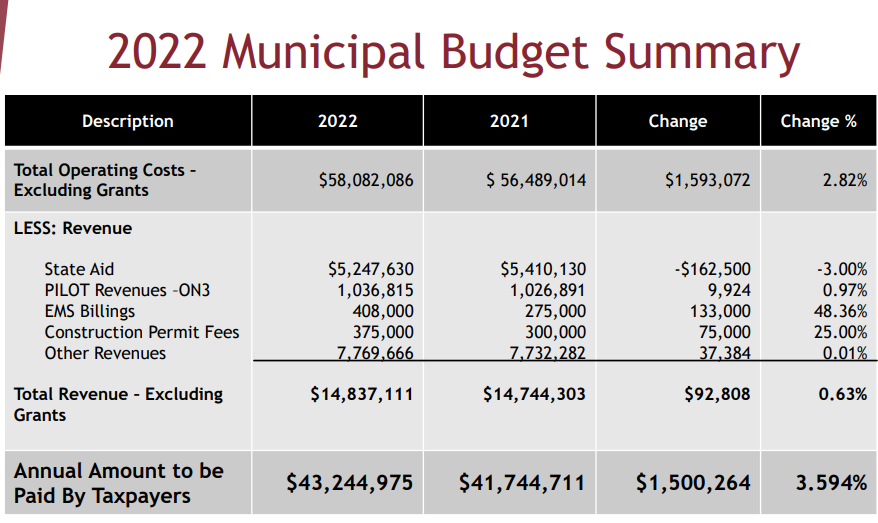 According to Evans, municipal operating costs have increased by $1,593,072 for 2022, which have been marginally offset by increased revenues of $92,808, resulting in a municipal tax increase to taxpayers of $1,500,264 – or 3.594 percent.