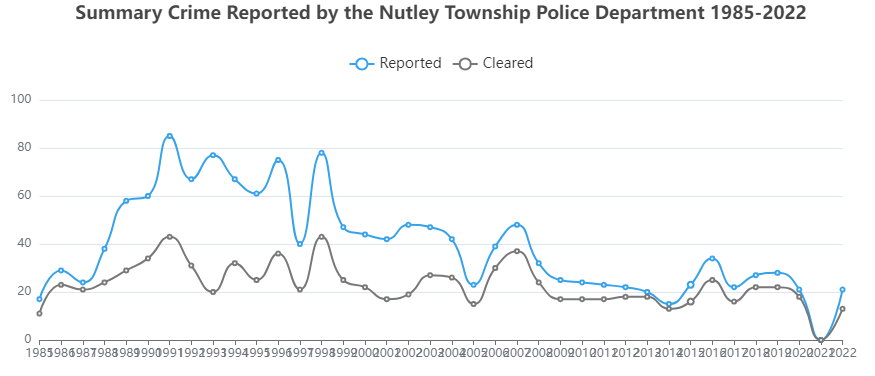 There were 21 violent crimes reported by the Nutley Police Department in 2022 – similar to pre-pandemic levels (21 crimes in 2020, and 28 crimes in 2019). Nutley's violent crime rate has also shrunk over the past three decades, with a high of 85 crimes reported in 1991.