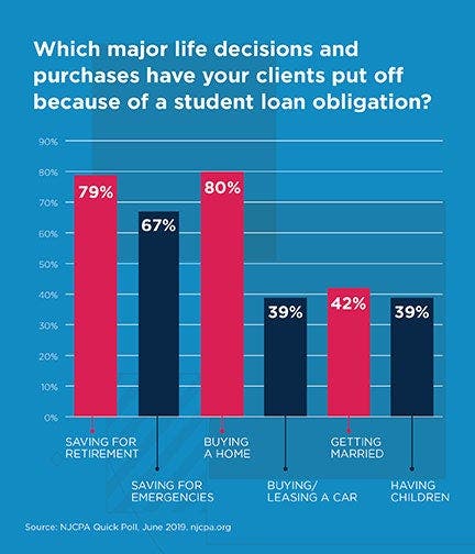 Earlier this summer, the NJCPA held a poll among its members, who said many of their clients are putting off major life decisions and purchases due to their high student loan debt, including buying homes, getting married or having kids.