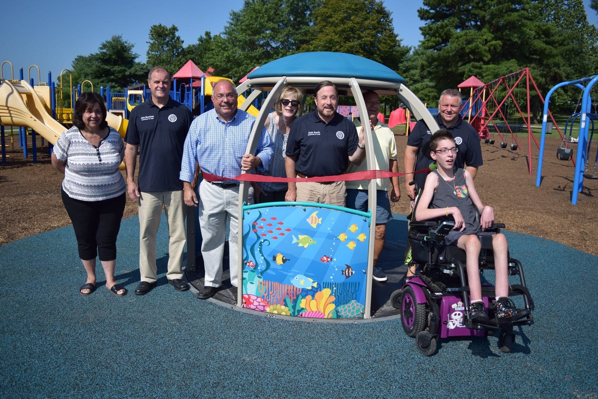 Amato, Township Council and Bayville Elks Lodge #2394 participated in the ribbon-cutting ceremony. Bayville Elks special needs ambassador Val Falzarano, who has cerebral palsy, participated in the event. Falzarano was all smiles as he took the maiden voyage on the We-Go-Round.