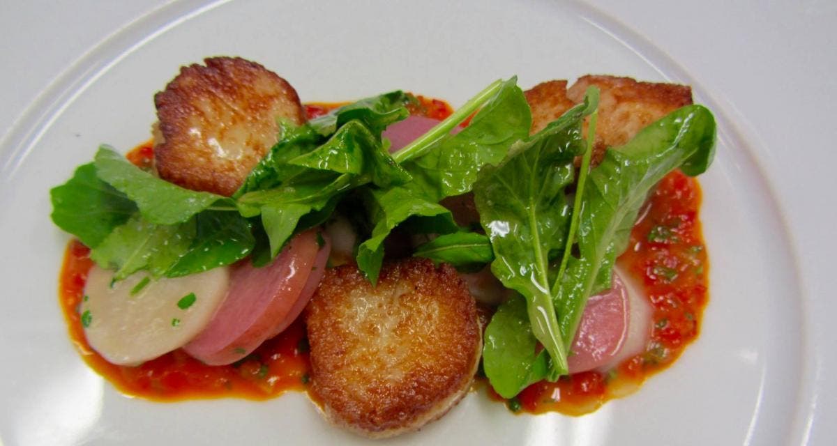 "Executive chef Andrew Lattanzio responds to praise with becoming modesty. When his chilled zucchini soup—a purée eventful with tender lobster, luscious burrata, snipped basil, tiny sourdough croutons and poignant violet flowers—is called creative, he replies, “It’s just basic.” He also shrugs off praise for his delicately seared scallops in a peperonata sauce beautifully poised between sweet and tart with a hint of heat.