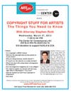 Topics will include copyright laws as they pertain to visual artists; when things become public domain; use of images found on the internet; use of images from magazines in artwork; whether or not to register artwork with the copyright office in Washington; protecting one’s work from copyright infringement, and more.