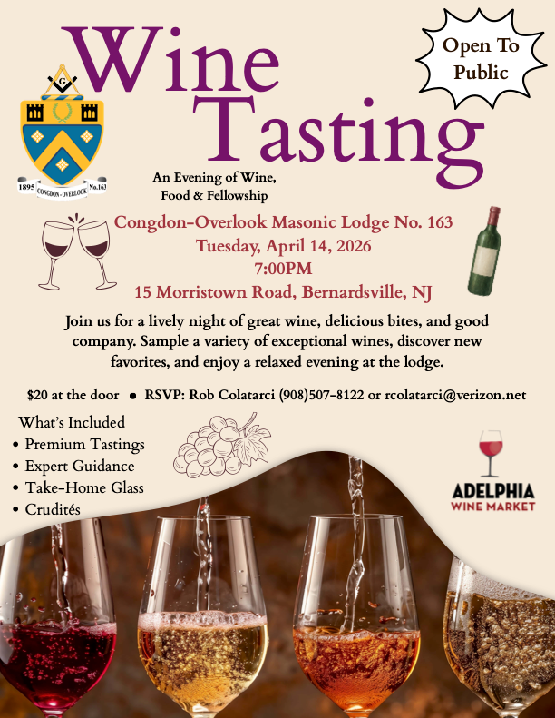 BERNARDSVILLE, NJ — A public wine tasting is scheduled for April 14 at the Masons Lodge of Somerset Hills in downtown Bernardsville.