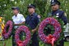 After McCarthy spoke there was a memorial flag-raising by township workers as the Bloomfield Civic Band played, “God Bless America.” At the base of the flagpole, surrounded by flowers, was an inscribed stone bearing the names of Alviar, Catherine A. Nardella and Daniel Rosetti, as well as a small, signed American flag and a framed memento.