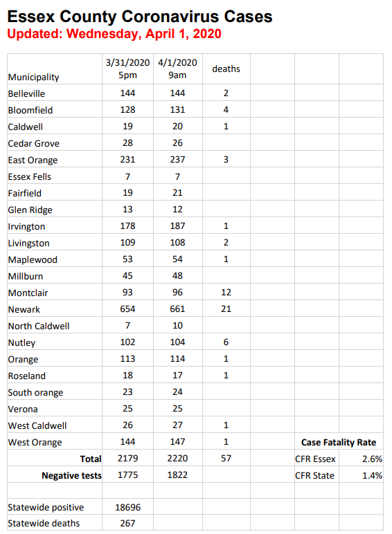 ESSEX COUNTY, NJ — Essex County has seen 57 deaths linked to the new coronavirus as of Wednesday morning, officials said.