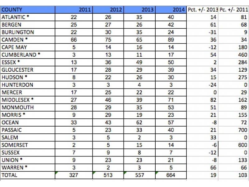 Camden, Middlesex, Ocean and Monmouth had the highest number of overdose deaths in 2014, while Bergen, Camden, Cumberland, Gloucester, Middlesex, Monmouth and Warren had the percentage highest increases from 2013.