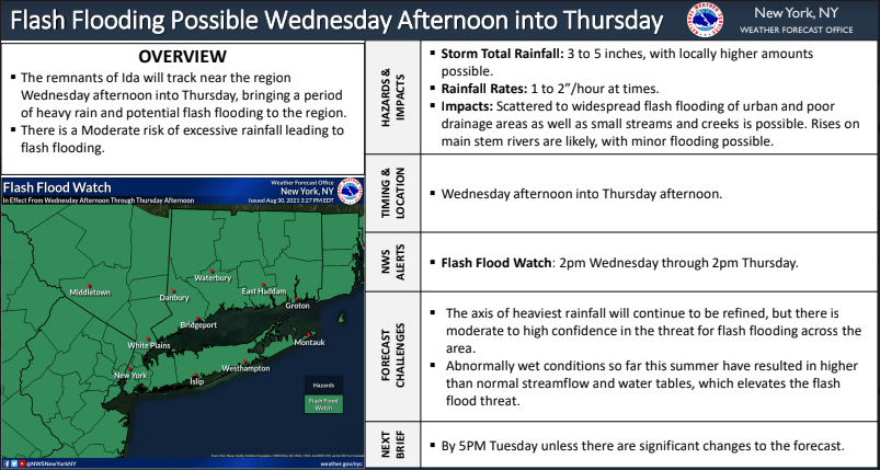 The flash flood watch for Bergen, Essex, Passaic, Union and Hudson Counties runs from 2 p.m. Wednesday to 2 p.m. Thursday. The area can also expect 3 to 5 inches of rain, with precipitation sometimes reaching 1 to 2 inches per hour, according to forecasts.