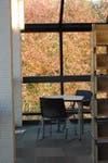 The removal of the staircase has created an open area beyond the circulation desk that could have a variety of uses. But accessing the second floor isn't limited to an elevator; instead, a dual stairway rises along the back wall, its framework designed to minimize obstructions of the view.