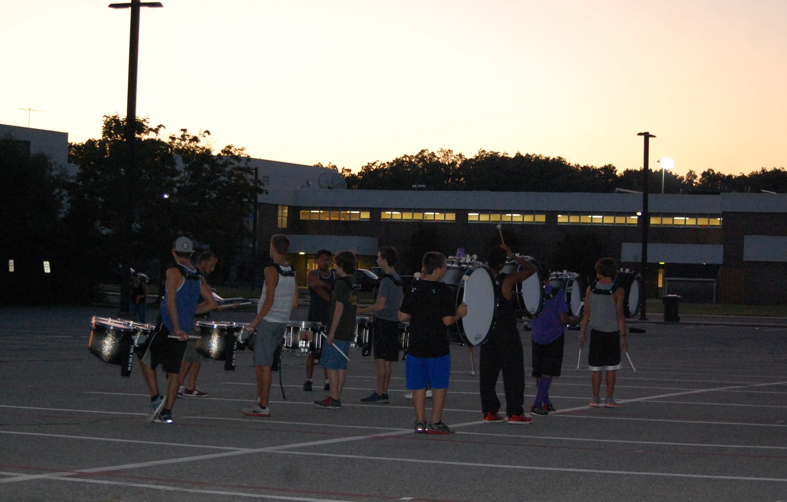 (PHOTO: Brick Memorial High School Marching Band drummers practice steps for a routine Wednesday night at the high school, following lines on a parking lot the band has used for a dozen years. The parking lot is at the back of the school, which is to the right of the drummers. Alexander Avenue, where residents have complained about the noise from the drums in particular, is to the drummers’ backs. Credit: Karen Wall)