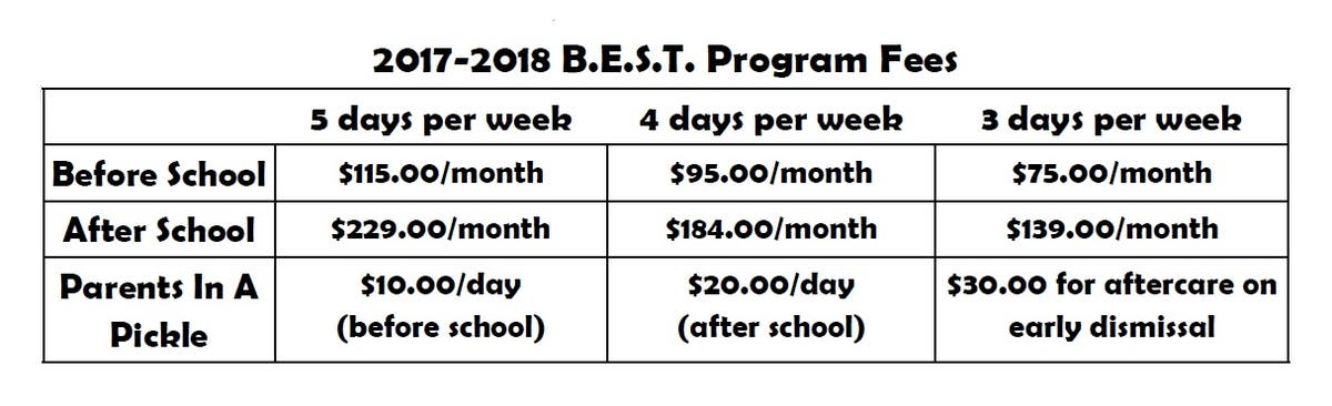 You can choose three-day, four-day and full week (five-day) programs at varying prices, with separate fees for before-school and afterschool care. There also is emergency participation, called "Parents in a Pickle," with per-day fees available. See the chart below.
