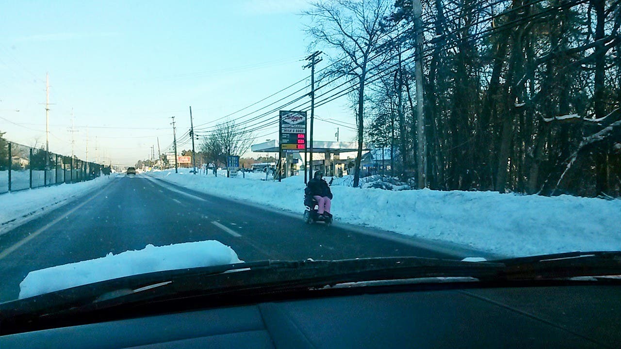 (A person on a motorized scooter rolls along Chambersbridge Road early Monday morning. Credit: Victor Finamore)