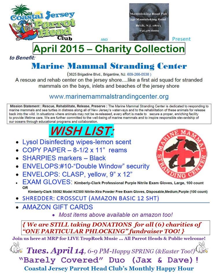 See flyer for more info and monthly collection for the Marine Mammal Stranding Center Wish list. Ongoing monthly collections are: Pop Top tabs for Ronald McDonald House and Box Tops and Labels for Education.