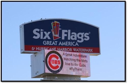 Near Chicago, Six Flags Great America is taunting the Mets with a sign outside their park that reads, “A Great Adventure: Watching the Mets lose to the Cubs.” While in New Jersey, visitors to Six Flags Fright Fest will see signs rooting for the Mets as they stroll the pumpkin and cobweb-adorned midways this weekend.