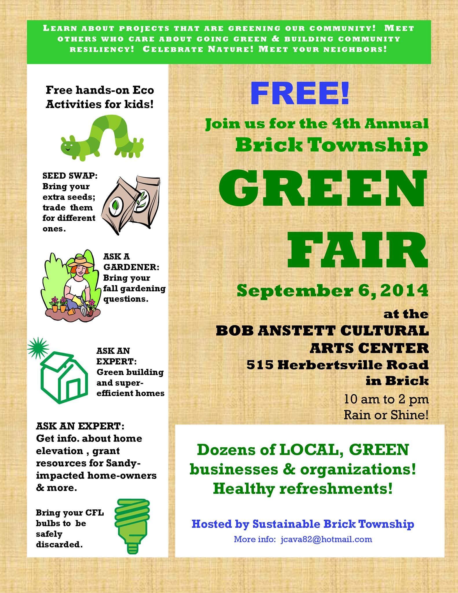 Come out to the fourth annual Brick Township Green Fair this Saturday, Sept. 6. The event, from 10 a.m. to 2 p.m. at the Bob Anstett Cultural Center, 515 Herbertsville Road, features a number of vendors and informational presentations.