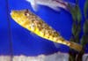 The mottled light green and yellow puffer glides slowly throught the giant saltwater tank, its neon-blue eyes ringed with orange twitching as the fish searches for food.