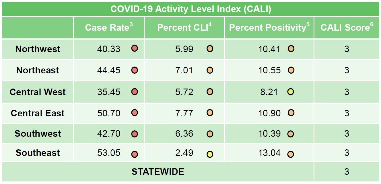 - The percent of COVID-19-like illnesses rose above 5.52 in each of the counties.