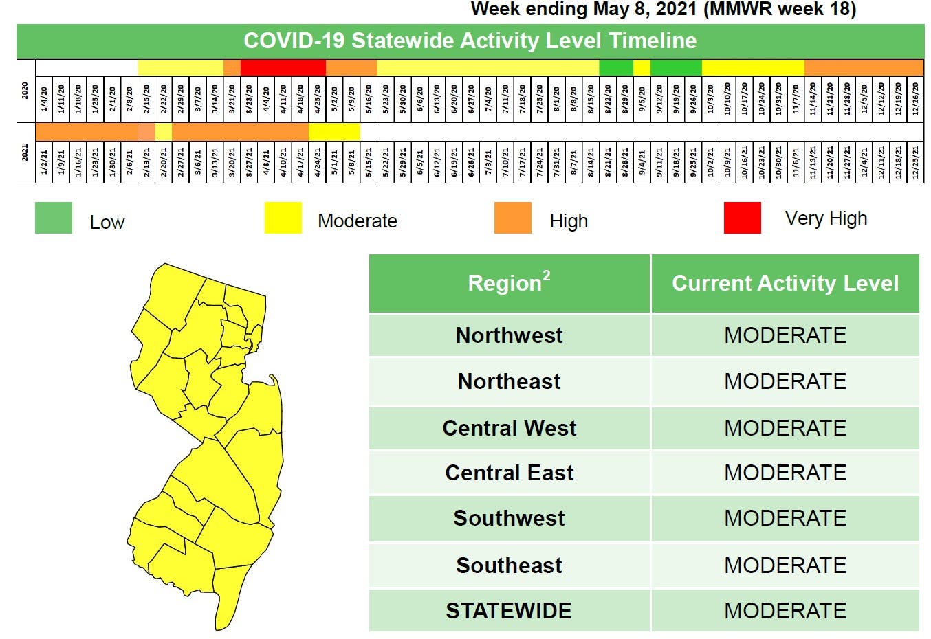 The New Jersey Department of Health's most recent COVID-19 Activity Level Report, issued Thursday for the week ending May 8, shows all of the state in the yellow "moderate risk" zone. Three of the regions remain in the high-risk zone, with a rate of just over 10 cases per 100,000 people.