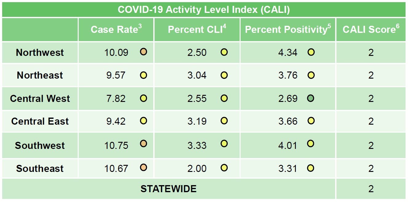 The other metrics reported in the COVID-19 Activity Level Index have decreased as well for Central East. The percentage of COVID-like illnesses is at 3.19, down from 3.67 reported last week and from 7.48 for the week ending April 10. The percent positivity is at 3.66, down from 5.29 last week and from 10.61 reported three weeks ago.