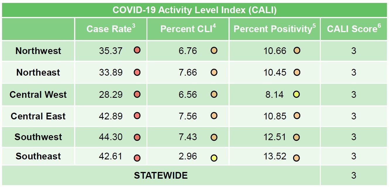 While the case rate is in the red zone, all of the numbers for the Central East region decreased from Dec. 11. The percentage of those with COVID-like illness (the CLI number) and the positivity rate both fell. The case rate was 46.02 as of Dec. 11, while the CLI percentage was 7.00 and the positivity rate had been 11.48.