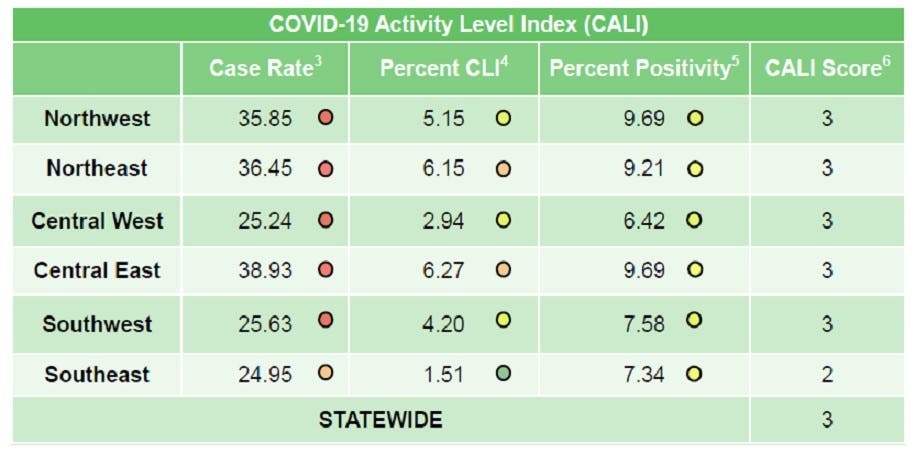 The percentage of COVID-like illnesses ticked down slightly, to 6.27, from 6.46 for March 13. The percent positivity rose significantly, to 9.69 from 8.50. The state's CALI report lags the current case counts by a week.