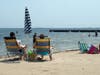 Today’s sunny weather also brought a small crowd of residents and visitors to Barnegat’s bay beach. As Scott and Amy Dacus of Lacey soaked up the midday sun with their two young daughters, they said they’re worried about what the storm could bring, but not too concerned about their own welfare – they live relatively far inland.