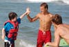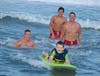 Jake Henderson, who’s almost 9, slapped high-fives with the lifeguards who were helping him ride the waves, first on his belly, then on his knees, and finally standing.