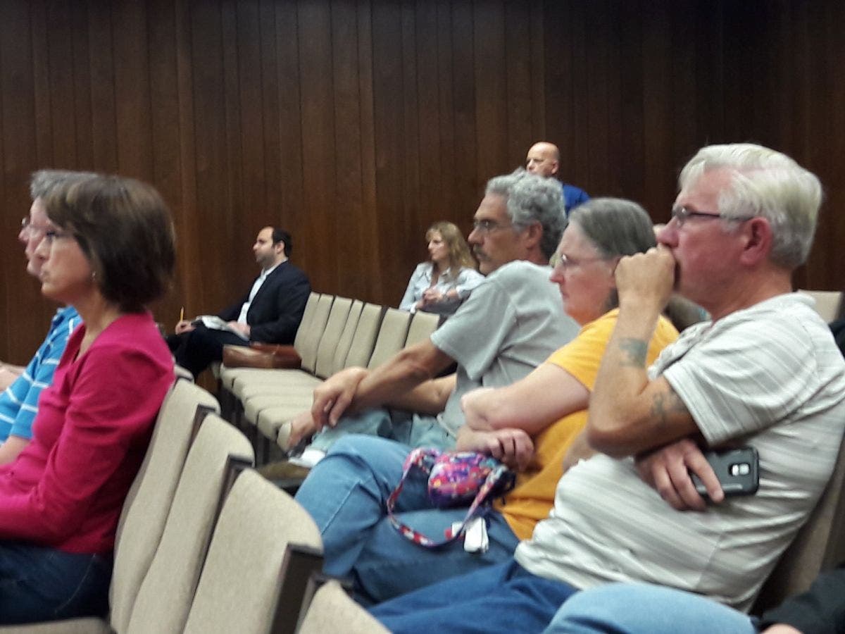 Top photo: Isaac Sassoon (center) listens to other speakers during the Brick Township Council meeting. Residents of the Duquesne Boulevard area (foreground) listen intently. They say parking issues have vexed them for months. Karen Wall photo