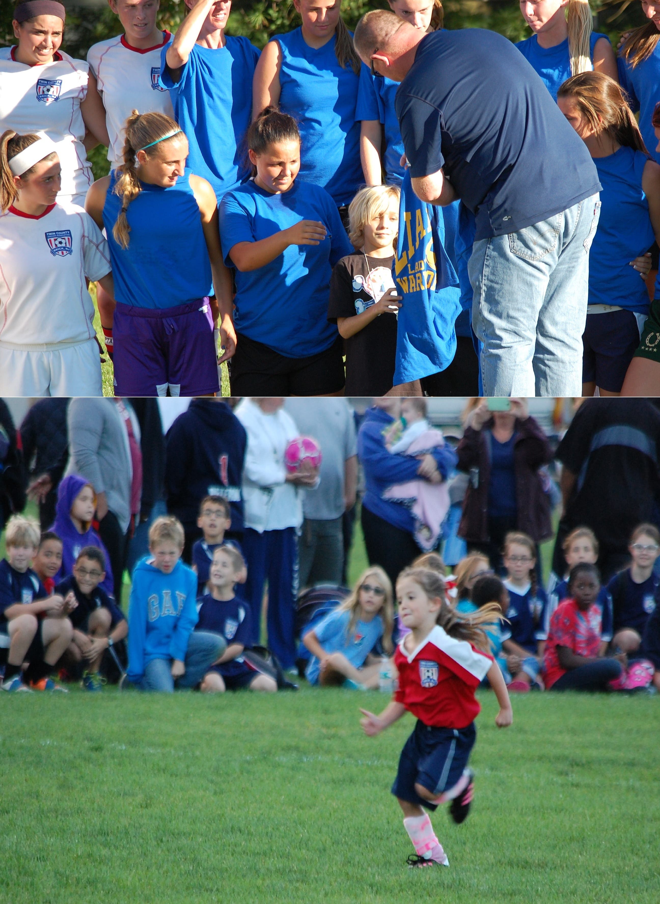 Downs was not forgotten either. Word of his death spread throughout Pinewood Park on Saturday, sparking impromptu trips down memory lane among those who knew him. On Tuesday, his presence was felt at Drum Point as well. As players prepared to take the field with Irelyn for her first soccer game, Brick High School girls soccer coach Mike Berardinelli presented her with her own Brick Dragons warmup shirt, which he said he was presenting on behalf of his team -- many of whom played for or were trained by Downs at some point.