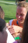 (1. Christie Rampone signs an autograph for the author’s daughter on July 4, 2009, as Sky Blue honored the 10th anniversary of the 1999 World Cup championship. 2. Christie Rampone, second from left in front, poses with campers at her soccer camp in 2011, days after the team returned from its World Cup defeat in Germany. The lessons and impact of Rampone’s 16 years on the U.S. women’s national team will continue to have a ripple effect on up-and-coming generations. Credit: Karen Wall)