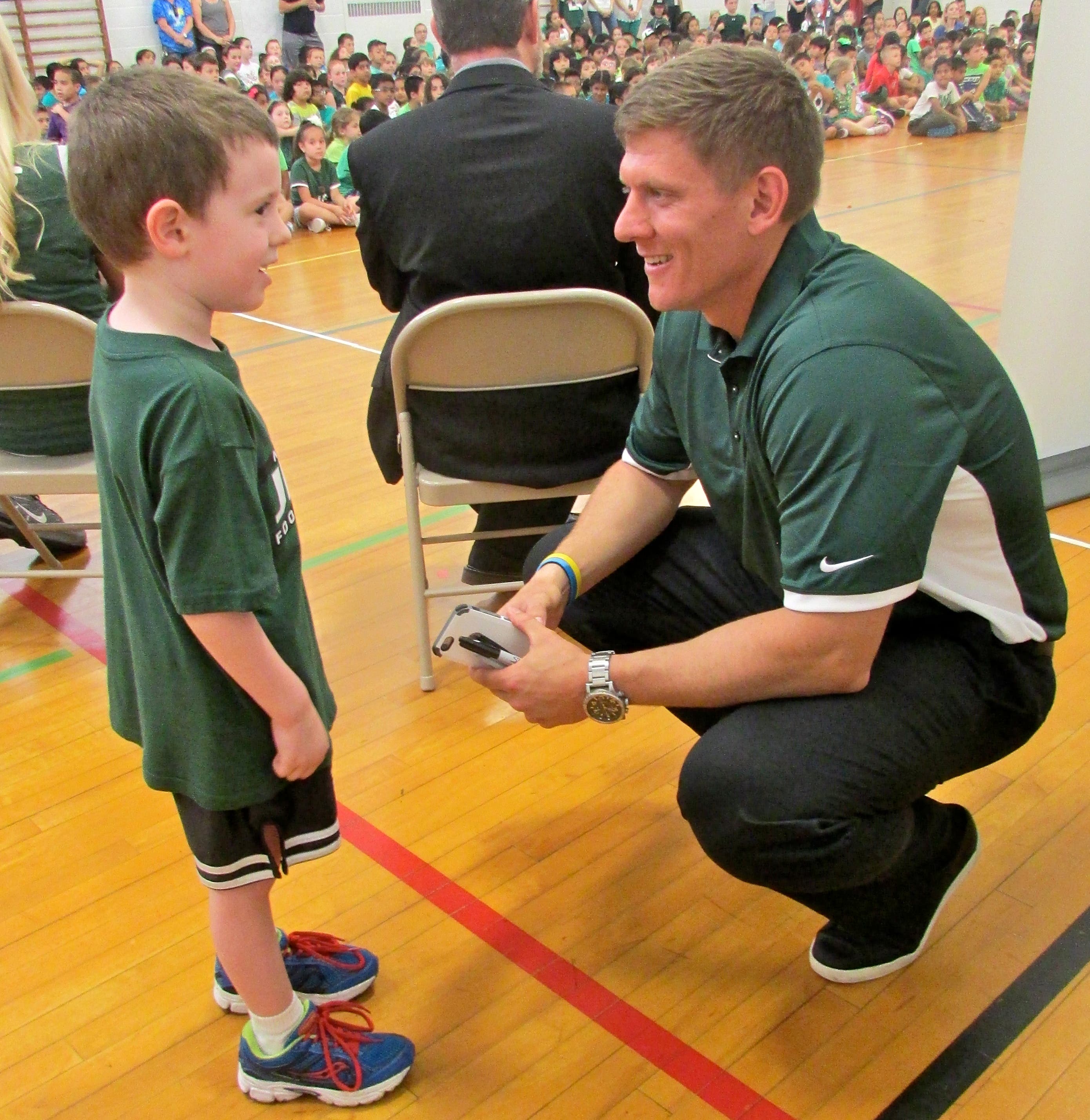 To welcome Folk, the entire student body – 569 children in preschool through fourth-grade - and staff wore green and/or Jets gear, decorated the gym where the assembly was held and some classrooms even made Jets hats.