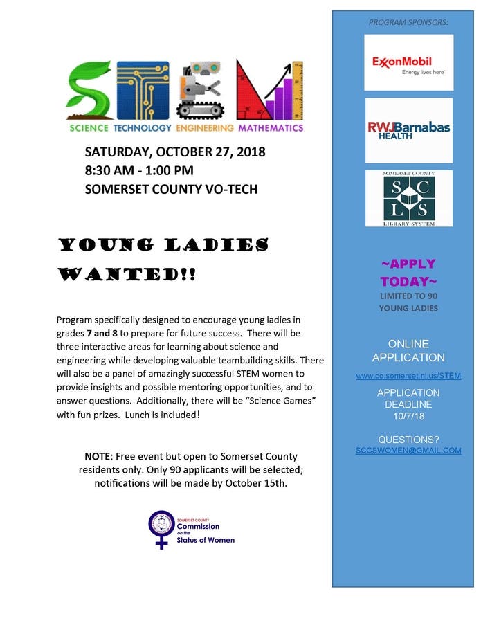 The free event is open to Somerset County residents only and is limited to 90 girls. Pre-registration is required. Apply by Oct. 7 by completing and emailing the application form at www.co.somerset.nj.us/STEM to SCCSWomen@gmail.com
