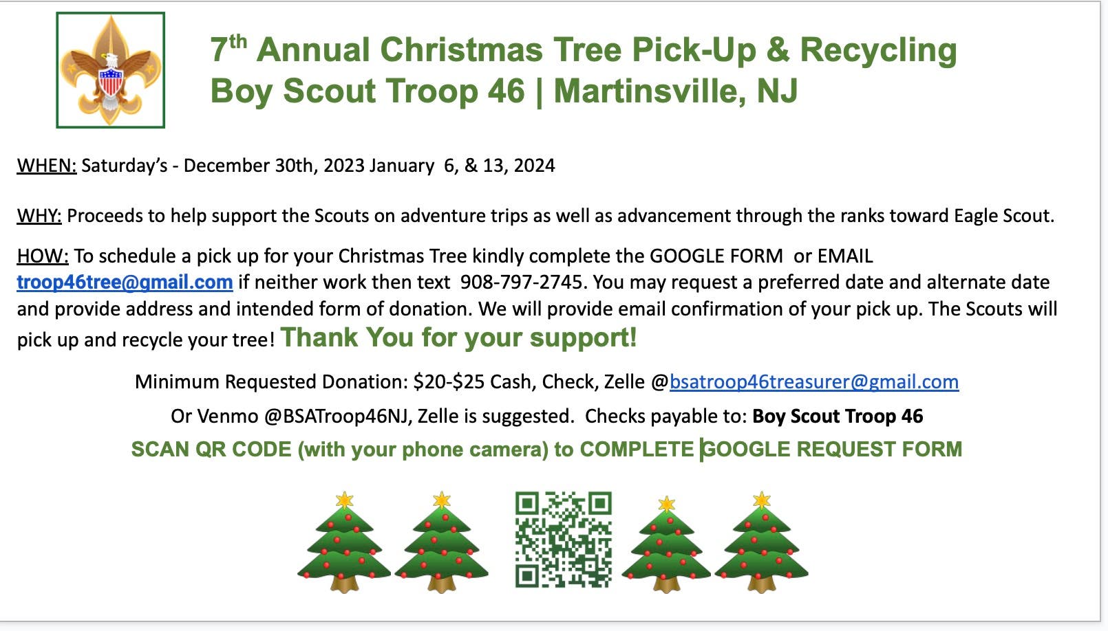 To schedule a pick up complete the Google form here or email troop46tree@gmail.com or text 908-797-2745.