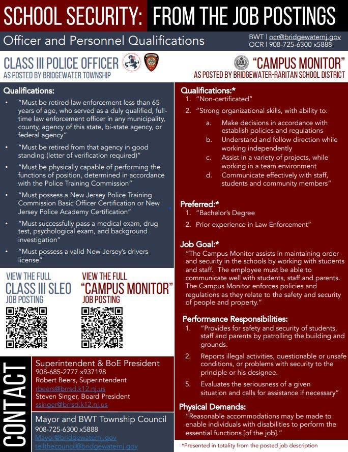 "Our campus monitors bring outstanding credentials in their previous positions as high-ranking officials in the New Jersey State Police, Somerset County Prosecutor's Office, and local police departments, each with over 20 years of service to the citizens of New Jersey. Three of our campus monitors have not only served their state but served their country in the Armed Forces. One of these new hires served as a Class III officer for the Bridgewater Police Department before joining the district directly. Only the most impeccable records from candidates were considered by the district in the hiring process," said Beers.