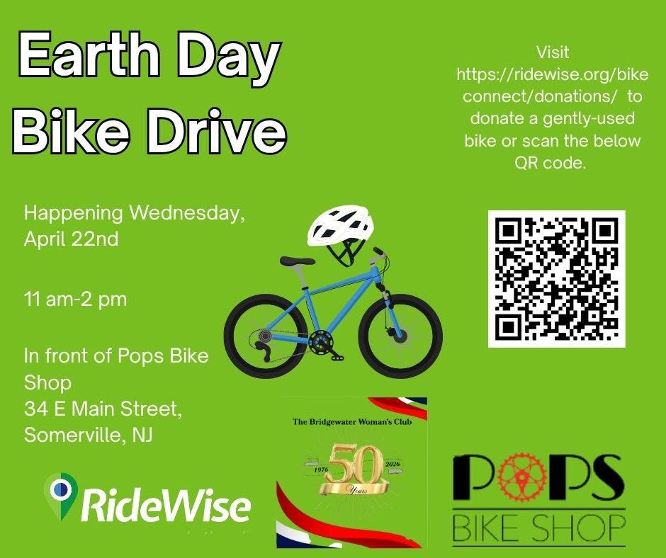 SOMERVILLE, NJ — RideWise is partnering with Pops Bike Shop and the Bridgewater Woman’s Club to host a free Earth Day bike drive on Wednesday, April 22, from 11 a.m. to 2 p.m. in front of Pops Bike Shop in downtown Somerville.