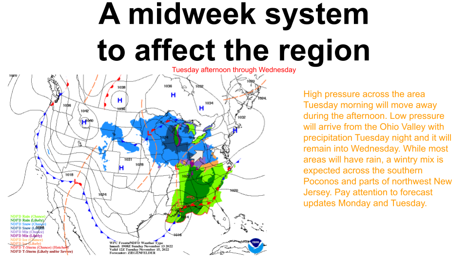 "We're keeping an eye on the Tuesday night system forecast to impact our region with a soaking rain and some wintry precip for the Poconos," said US National Weather Service Philadelphia/Mount Holly.